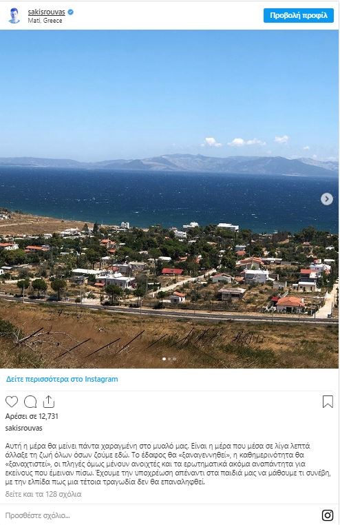 Ο τραγουδιστής, λοιπόν θέλησε να στείλει το δικό του μήνυμα με αφορμή τη μαύρη επέτειο από εκείνη την μέρα της φονικής πυρκαγιάς που στοίχισε τη ζωή σε 102 συνανθρώπους μας. «Αυτή η μέρα θα μείνει πάντα χαραγμένη στο μυαλό μας. Είναι η μέρα που μέσα σε λίγα λεπτά άλλαξε τη ζωή όλων όσων ζούμε εδώ. Το έδαφος θα «ξαναγεννηθεί», η καθημερινότητα θα «ξαναχτιστεί», οι πληγές όμως μένουν ανοιχτές και τα ερωτηματικά ακόμα αναπάντητα για εκείνους που έμειναν πίσω. Έχουμε την υποχρέωση απέναντι στα παιδιά μας να μάθουμε τι συνέβη, με την ελπίδα πως μια τέτοια τραγωδία δεν θα επαναληφθεί» έγραψε χαρακτηριστικά ο Σάκης Ρουβάς.