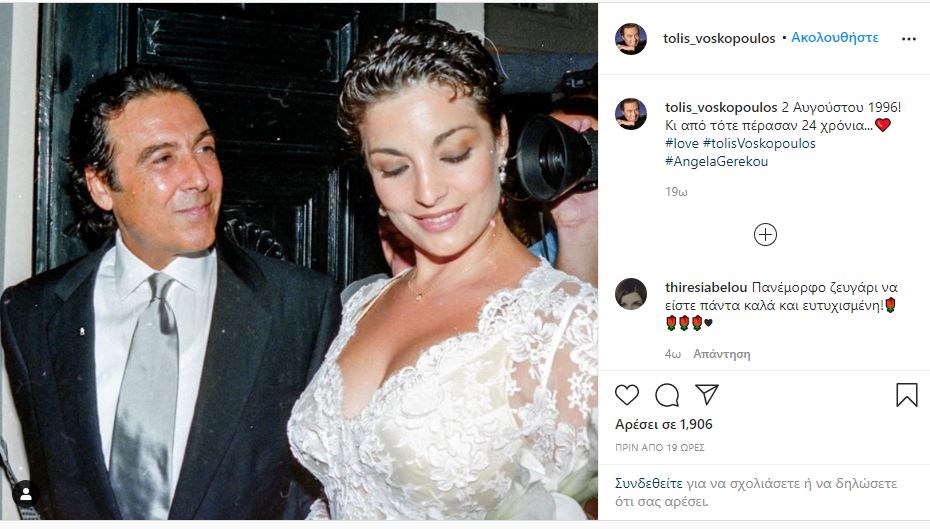 Μπορεί να έχουν περάσει 24 χρόνια από τότε που ένωσαν τις ζωές τους, όμως ο Τόλης Βοσκόπουλος είναι πιο ερωτευμένος και ευτυχισμένος από ποτέ με τη σύζυγό του, Άντζελα Γκερέκου. Την Κυριακή 2 Αυγούστου είχαν επέτειο γάμο, συμπληρώνοντας 24 χρόνια κοινού βίου και ο τραγουδιστής έκανε μια τρυφερή ανάρτηση στον προσωπικό λογαριασμό του στο Instagram. Συγκεκριμένα ανέβασε μια φωτογραφία από την ημέρα του γάμου τους στην Κέρκυρα και τη συνόδευσε με το εξής σχόλιο: «2 Αυγούστου 1996! Κι από τότε πέρασαν 24 χρόνια», ενώ δίπλα έβαλε μια κόκκινη καρδιά. Σημειώνεται ότι ο Τόλης Βοσκόπουλος και η Άντζελα Γκερέκου παντρεύτηκαν στην Κέρκυρα στις 2 Αυγούστου 1996 ενώ έχουν αποκτήσει μια κόρη, τη Μαρία που γεννήθηκε το 2001.