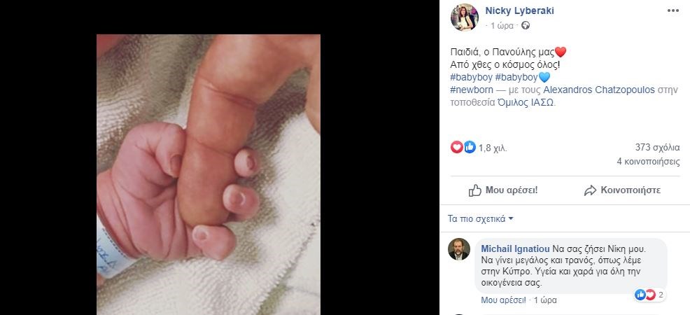 Σε πελάγη ευτυχίας πλέει η δημοσιογράφος Νίκη Λυμπεράκη. Η παρουσιάστρια του κεντρικού δελτίου ειδήσεων του OPEN έφερε στον κόσμο το πρώτο της παιδί, καρπό του έρωτά της με τον Αλέξανδρο Χατζόπουλο. Ο σύντροφός της δεν έφυγε στιγμή από το πλευρό της δημοσιογράφου που γέννησε χθες με προγραμματισμένο τοκετό. Η Νίκη Λυμπεράκη δημοσίευσε μια φωτογραφία μέσα από το μαιευτήριο στην οποία φαίνεται να κρατά το χεράκι του νεογέννητου γιου της.