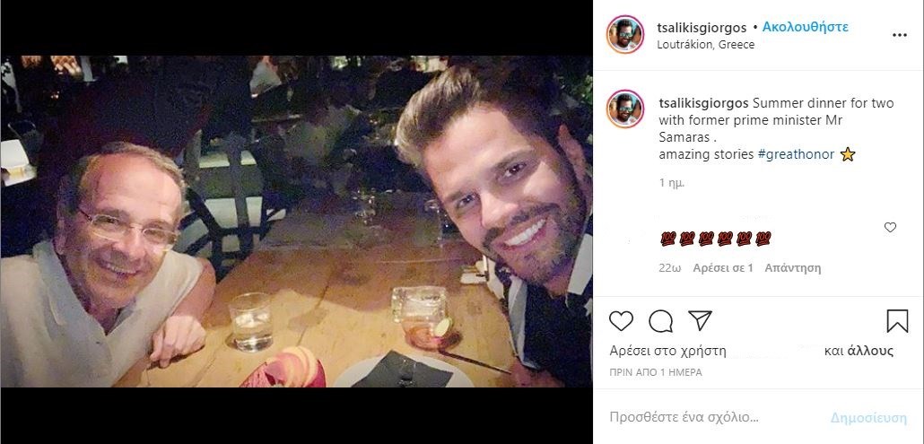 O Γιώργος Τσαλίκης ανήρτησε φωτογραφία από το δείπνο του με τον Αντώνη Σαμαρά όπου κοιτάζουν και οι δύο χαμογελαστοί την κάμερα, ενώ ο τραγουδιστής ανέφερε ότι άκουσε υπέροχες ιστορίες και ήταν μεγάλη του τιμή να δειπνήσει με τον πρώην πρωθυπουργό.
