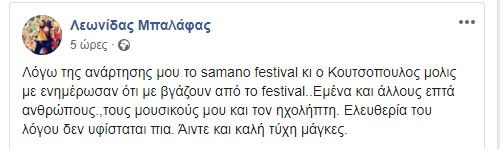 Λίγες ημέρες μετά ο γνωστός καλλιτέχνης επέστρεψε με νέα ανάρτηση κατηγορώντας τον Λεωνίδα Κουτσόπουλο ότι τον έβγαλε από το line up του φεστιβάλ: «Λόγω της ανάρτησης μου το samano festival κι ο Κουτσόπουλος μόλις με ενημέρωσαν ότι με βγάζουν από το festival..Εμένα και άλλους επτά ανθρώπους.,τους μουσικούς μου και τον ηχολήπτη. Ελευθερία του λόγου δεν υφίσταται πια. Άιντε και καλή τύχη μάγκες».