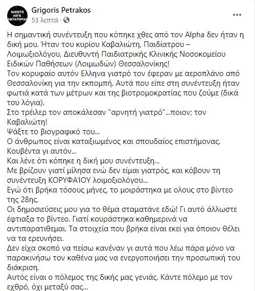“Η σημαντική συνέντευξη που κόπηκε χθες από τον Alpha δεν ήταν η δική μου. Ήταν του κυρίου Καβαλιώτη, Παιδίατρου – Λοιμωξιολόγου, Διευθυντή Παιδιατρικής Κλινικής Νοσοκομείου Ειδικών Παθήσεων (Λοιμωδών) Θεσσαλονίκης! Τον κορυφαίο αυτόν Ελληνα γιατρό τον έφεραν με αεροπλάνο από Θεσσαλονίκη για την εκπομπή. Αυτά που είπε στη συνέντευξη ήταν φωτιά κατά των μέτρων και της βιοτρομοκρατίας που ζούμε (δικά του λόγια). Στο τρέιλερ τον αποκάλεσαν “αρνητή γιατρό”…ποιον; τον Καβαλιώτη! Ψάξτε το βιογραφικό του… Ο άνθρωπος είναι καταξιωμένος και σπουδαίος επιστήμονας. Κουβέντα γι’ αυτόν… Και λένε ότι κόπηκε η δική μου συνέντευξη… Με βρίζουν γιατί μίλησα ενώ δεν είμαι γιατρός, και κόβουν τη συνέντευξη ΚΟΡΥΦΑΊΟΥ λοιμωξιολόγου… Εγώ ότι βρήκα τόσους μήνες, το μοιράστηκα με όλους στο βίντεο της 28ης. Οι δημοσιεύσεις μου για το θέμα σταματάνε εδώ! Γι’ αυτό άλλωστε έφτιαξα το βίντεο. Γιατί κουράστηκα καθημερινά να αντιπαρατίθεμαι. Τα στοιχεία που βρήκα είναι εκεί για όποιον θέλει να τα ερευνήσει. Δεν είχα σκοπό να πείσω κανέναν γι’ αυτά που λέω πάρα μόνο να παρακινήσω τον καθένα μας να ενεργοποιήσει την προσωπική του διάκριση. Αυτός είναι ο πόλεμος της δικής μας γενιάς. Κάντε πόλεμο με τον εχθρό, όχι μεταξύ σας…”
