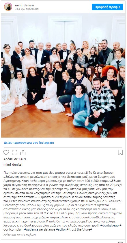 Δεν μπορώ όμως άλλη γκρίνια. Μίρλα συνέχεια. Ναι πλήττεται απίστευτα ο δικός μας κλάδος όσο λίγοι αλλά ας κοιτάξουμε να σώσουμε ό,τι μπορούμε μέσα από την ΠΕΘ και το ΣΕΗ. Όλοι μαζί. Δουλεία, δράση, δίκαια αιτήματα, επιμονή, σύμπνοια, όχι μιζέρια, παρακαλετά και συνωμοσιολογία! Καλλιτέχνες είμαστε και η τέχνη έχει ρίσκο και πάλι θα τα καταφέρουμε. Προτείνω να μιλάμε λιγότερο και να δουλεύουμε όλοι μαζί για τον κλάδο περισσότερο!», έγραψε η Μιμή Ντενίση, ποστάροντας φωτογραφία του θιάσου της.