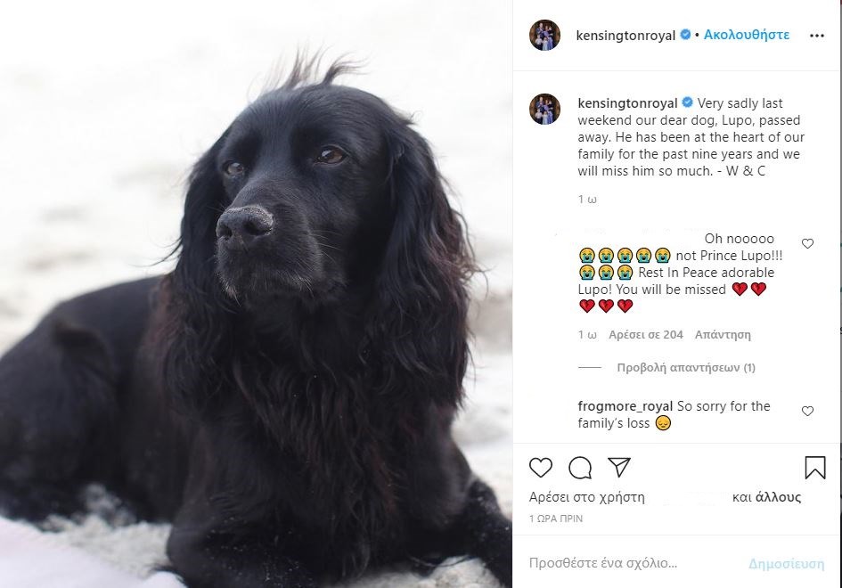 Συντετριμμένοι είναι ο πρίγκιπας Ουίλιαμ και η Κέιτ Μίντλετον καθώς ο πολυαγαπημένος τους σκύλος Λούπο πέθανε σε ηλικία μόλις εννέα ετών. Το ζευγάρι ανακοίνωσε τη μεγάλη απώλεια για την οικογένειά του με μια φωτογραφία του Λούπο στο instagram.