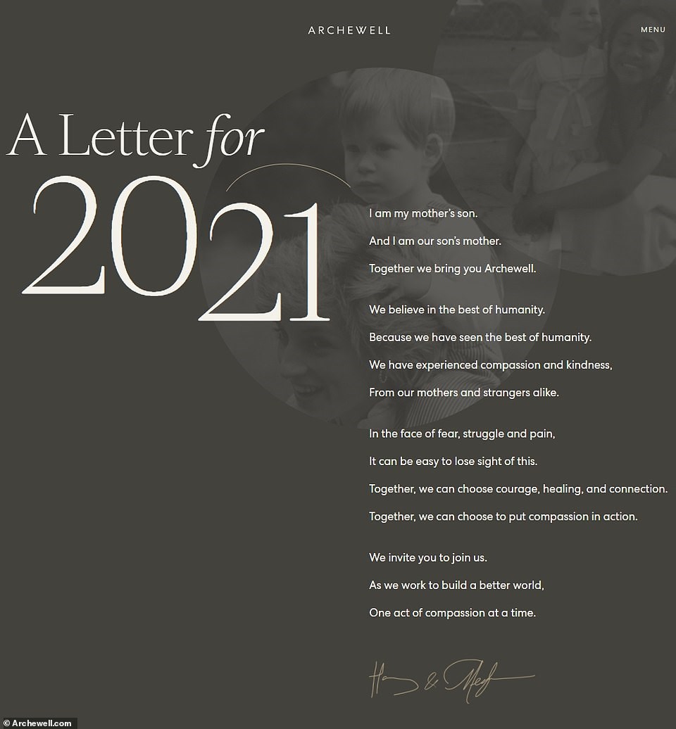 Ο Χάρι και η Μέγκαν έθεσαν τον στόχο τους να “φτιάξουν έναν καλύτερο κόσμο” σε ανοιχτή επιστολή στο νέο site τους, λέγοντας ότι θέλουν να εξαπολύσουν τη δύναμη της συμπόνοιας, ενώ παράλληλα παρουσίασαν τις εμπορικές δραστηριότητές τους, το Archewell Audio, το brand που επέλεξαν για τη συμφωνία με το Spotify, και το Archewell Productions, για τη συνεργασία τους με τη Netflix.