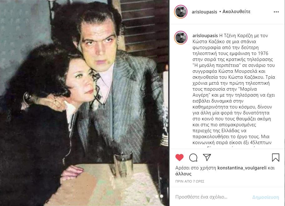 Μία σπάνια φωτογραφία της Τζένης Καρέζη και του Κώστα Καζάκου ανήρτησε στον προσωπικό του λογαριασμό στο instagram o λάτρης του ελληνικού κινηματογράφου και συλλέκτης, Άρης Λουπάσης, με αφορμή τα γενέθλια της θρυλικής Ελληνίδας σταρ με τα ωραιότερα μάτια στον χώρο του ελληνικού θεάτρου και κινηματογράφου. Η φωτογραφία όπως ο ίδιος γράφει είναι από τη δεύτερη τηλεοπτική τους εμφάνιση το 1976 στη σειρά της κρατικής τηλεόρασης “Η μεγάλη περιπέτεια” σε σενάριο του συγγραφέα Κώστα Μουρσελά και σκηνοθεσία του Κώστα Καζάκου.