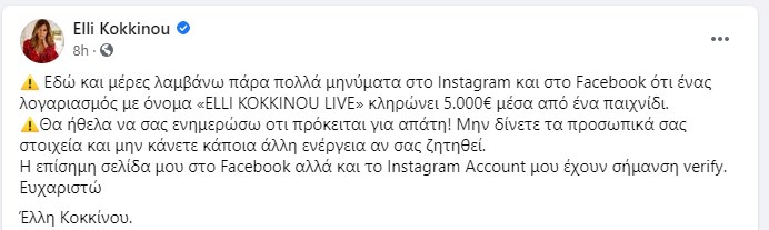 “⚠️ Εδώ και μέρες λαμβάνω πάρα πολλά μηνύματα στο Instagram και στο Facebook ότι ένας λογαριασμός με όνομα «ELLI KOKKINOU LIVE» κληρώνει 5.000€ μέσα από ένα παιχνίδι. ⚠️Θα ήθελα να σας ενημερώσω οτι πρόκειται για απάτη! Μην δίνετε τα προσωπικά σας στοιχεία και μην κάνετε κάποια άλλη ενέργεια αν σας ζητηθεί. Η επίσημη σελίδα μου στο Facebook αλλά και το Instagram Account μου έχουν σήμανση verify. Ευχαριστώ Έλλη Κοκκίνου” έγραψε η τραγουδίστρια στον λογαριασμό της στο Facebook.