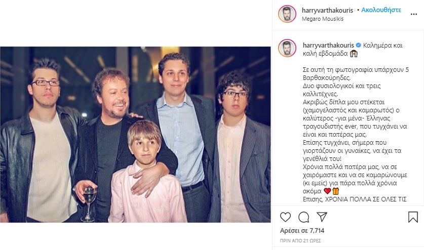 Ο Χάρης Βαρθακούρης ανέβασε μία φωτογραφία στον προσωπικό λογαριασμό του στο Instagram στην οποία απεικονίζεται ο γνωστός τραγουδιστής με τους τέσσερις γιους του και έγραψε: ” Σε αυτή τη φωτογραφία υπάρχουν πέντε Βαρθακούρηδες. Δυο φυσιολογικοί και τρεις καλλιτέχνες. Ακριβώς δίπλα μου στέκεται (χαμογελαστός και καμαρωτός) ο καλύτερος -για μένα- Έλληνας τραγουδιστής ever, που τυγχάνει να είναι και πατέρας μας. Επίσης τυγχάνει, σήμερα που γιορτάζουν οι γυναίκες, να έχει τα γενέθλιά του! Χρόνια πολλά πατέρα μας, να σε χαιρόμαστε και να σε καμαρώνουμε (κι εμείς) για πάρα πολλά χρόνια ακόμα. Επίσης, ΧΡΟΝΙΑ ΠΟΛΛΑ ΣΕ ΟΛΕΣ ΤΙΣ ΓΥΝΑΙΚΕΣ… και λίγο παραπάνω στις δικές μας ο καθένας”.