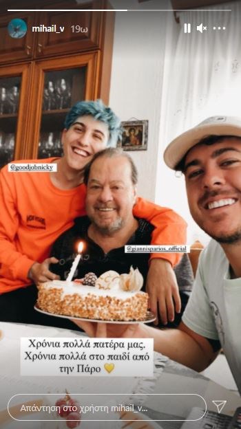 Ο Μιχαήλ-Άγγελος Βαρθακούρης με τη σειρά του δημοσίευσε μία φωτογραφία με τον πατέρα του και τον αδελφό του, κρατώντας την τούρτα στην οποία υπάρχει πάνω ένα λευκό κεράκι.
