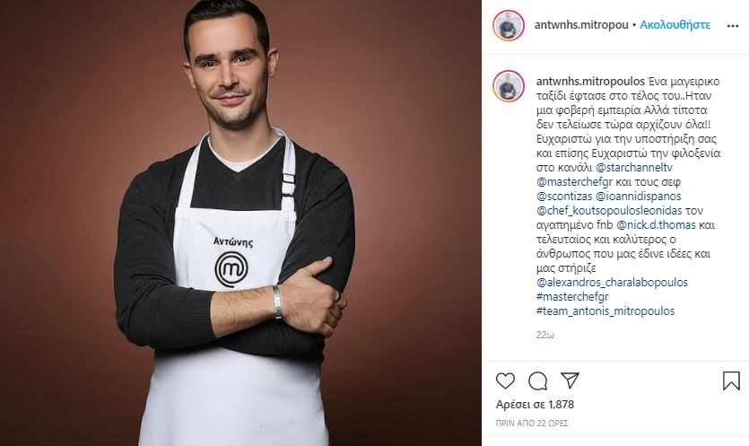Ο Αντώνης Μητρόπουλος είχε το χειρότερο και είδε την πόρτα της εξόδου. Ο πρώην παίκτης του ριάλιτι μαγειρικής ανέβασε μία φωτογραφία του στην οποία φορά την ποδιά του MasterChef και έγραψε: “Ένα μαγειρικό ταξίδι έφτασε στο τέλος του..Ήταν μια φοβερή εμπειρία Αλλά τίποτα δεν τελείωσε τώρα αρχίζουν όλα!!Ευχαριστώ για την υποστήριξη σας και επίσης Ευχαριστώ την φιλοξενία στο κανάλι @starchanneltv @masterchefgr και τους σεφ @scontizas @ioannidispanos @chef_koutsopoulosleonidas τον αγαπημένο fnb @nick.d.thomas και τελευταίος και καλύτερος ο άνθρωπος που μας έδινε ιδέες και μας στήριζε @alexandros_charalabopoulos”.