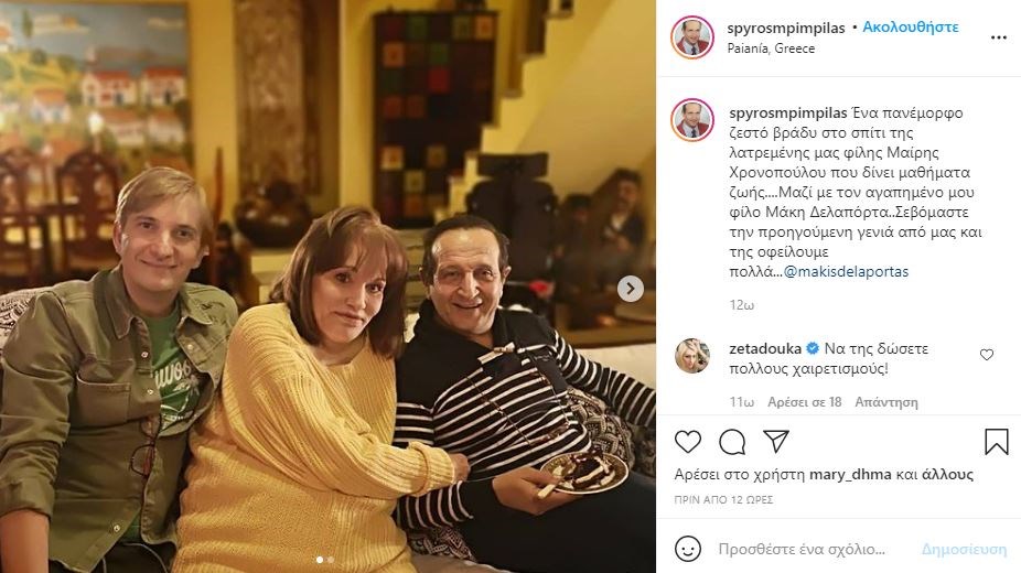 “Ένα πανέμορφο ζεστό βράδυ στο σπίτι της λατρεμένης μας φίλης Μαίρης Χρονοπούλου που δίνει μαθήματα ζωής… Μαζί με τον αγαπημένο μου φίλο Μάκη Δελαπόρτα.. Σεβόμαστε την προηγούμενη γενιά από μας και της οφείλουμε πολλά…”, ήταν το σχόλιο με το οποίο συνόδευσε τις φωτογραφίες ο Σπύρος Μπιμπίλας.