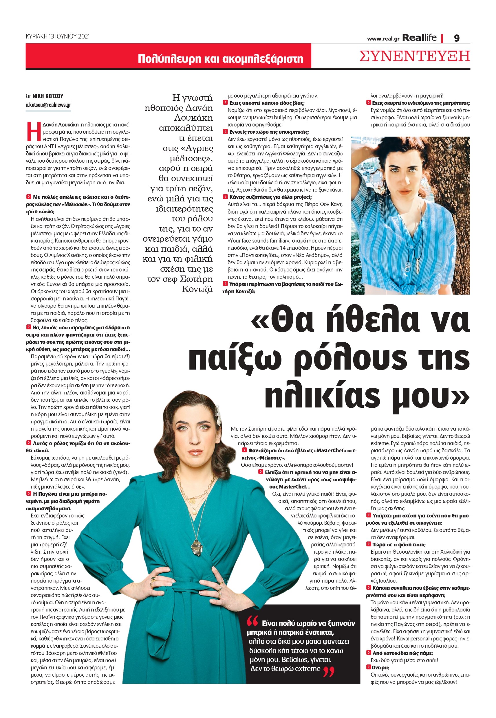 Εύχομαι, ωστόσο, να μη με ακολουθεί με ρόλους 45άρας, αλλά με ρόλους της ηλικίας μου, γιατί τώρα έχω ανέβει πολύ ηλικιακά (γελά). Με βλέπω στη σειρά και λέω «ρε Δανάη, πώς μπαντάλεψες έτσι;».