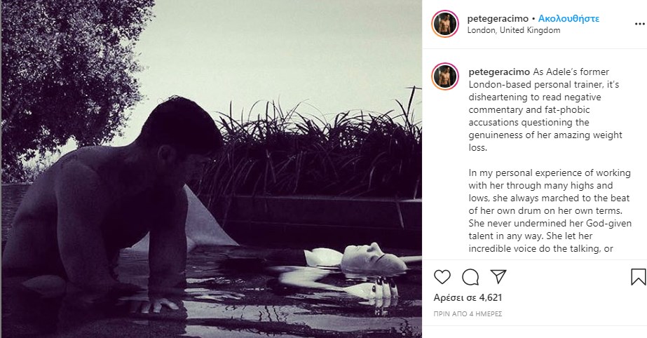 “Από τότε που μετακόμισε στο Λος Άντζελες, πέρασε και κάποιες αλλαγές στην προσωπική της ζωή. Είναι φυσικό να αποκτάς μια άλλη αίσθηση για τη ζωή σου έπειτα από τέτοια αλλαγή. Η Adele υιοθέτησε νέες διατροφικές συνήθειες και ήθελε να είναι η καλύτερη και αφοσιώθηκε στη γυμναστική και “χύνει ιδρώτα”. Δεν θα μπορούσα να είμαι περισσότερο υπερήφανος για εκείνη. Η μεταμόρφωσή της δεν είναι για κάποιο άλμπουμ, ούτε για δημοσιότητα, ούτε για να γίνει πρότυπο. Το κάνει για τον εαυτό της και για τον Άντζελο. Γ ελπίδα μου είναι οι άνθρωποι να εκτιμήσουν τη δουλειά που έκανε. Δεν έχασε το βάρος για να κάνει άλλους να αισθάνονται άσχημα για τον εαυτό τους. Αυτή η προσωπική μεταμόρφωση δεν έχει να κάνει με εμένα ή με εσάς. Είναι το πώς θέλει η Adele να ζήσει τη ζωή της. Δεν άλλαξε από την Adele που αγαπήσαμε” πρόσθεσε.