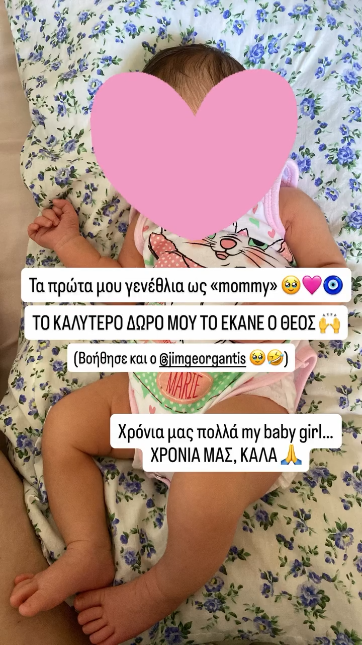 Συγκεκριμένα, η ηθοποιός δημοσίευσε, με την μορφή του story, μία φωτογραφία της λίγων ημερών κόρης της. Στο στιγμιότυπο βλέπουμε το μωρό ξαπλωμένο, ενώ φοράει ένα πολύ γλυκό φορμάκι. Η μαμά του και εορτάζουσα, έχει φροντίσει να κρύψει το πρόσωπό του, βάζοντας μία ροζ καρδιά.