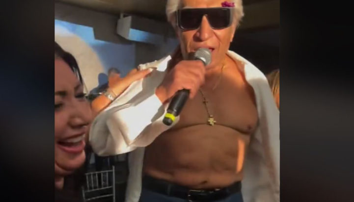 Το βίντεο που κυκλοφορεί στην πλατφόρμα του TikTok αποτυπώνουν το αποκορύφωμα της βραδιάς, με μια θαυμάστριά του να του σκίζει το πουκάμισο πάνω στην πίστα και τον καλλιτέχνη να χορεύει πλέον γυμνόστηθος στους ρυθμούς της ορχήστρας του.