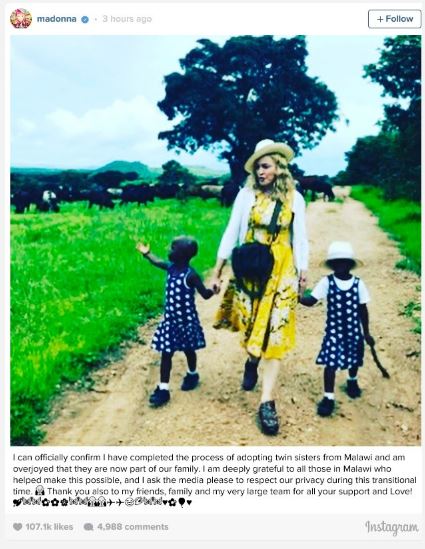 Μια φωτογραφία με τα δίδυμα κοριτσάκια από το Μαλάουι που υιοθέτησε, ανέβασε στον λογαριασμό της στο Instagram η Μαντόνα, επιβεβαιώνοντας ότι πλέον είναι μαμά έξι παιδιών!