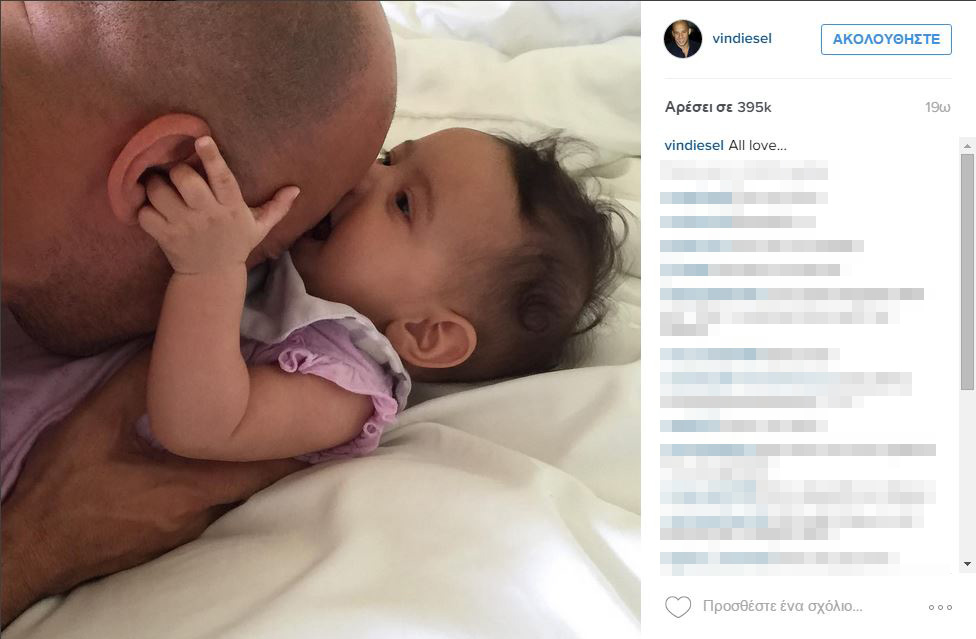 Μία πολύ τρυφερή φωτογραφία με την μόλις 4 μηνών κόρη του ανέβασε στον προσωπικό του λογαριασμό στο Instagram ο διάσημος ηθοποιός Βιν Ντίζελ.