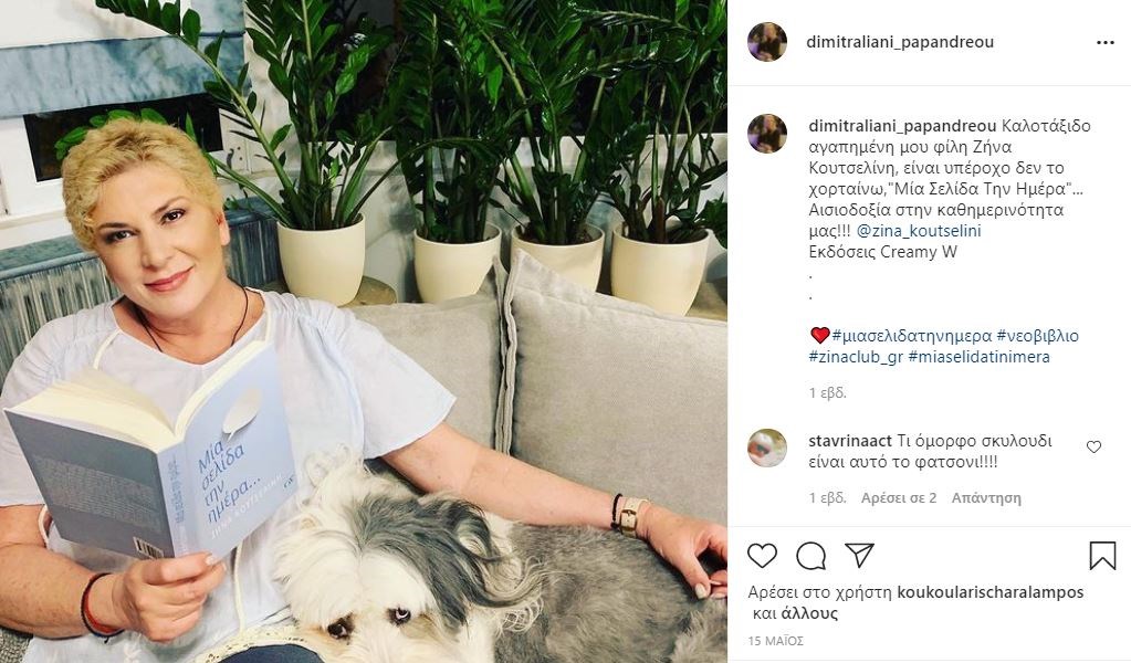 Στη φωτογραφία ποζάρει χαμογελαστή δίπλα σε ένα χαριτωμένο σκυλάκι και κρατώντας στο χέρι το βιβλίο της Ζήνας Κουτσελίνη “Μία σελίδα την ημέρα”. Τα σχόλια των διαδικτυακών της φίλων για την αλλαγή στην εμφάνισή της ήταν πολύ θετικά.
