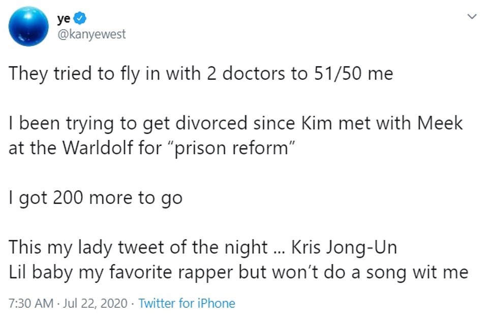 “Η Κρις και η Κιμ εξέδωσαν ανακοίνωση χωρίς την αποδοχή μου… αυτό δεν το κάνει μία σύζυγος” είπε ο Κάνιε μετά τις αναφορές ότι οι Καρντάσιαν ήταν έξαλλες με τις τελευταίες δηλώσεις του. Ο Κάνιε διέγραψε τις τελευταίες αναρτήσεις αφήνοντας μόνο μία όπου την υπέγραφε ως ως “μέλλων πρόεδρος”. Οι φήμες για διαζύγιο ανάμεσα στο ζευγάρι έρχεται μετά τις αποκαλύψεις από πηγές ότι Κιμ και Κάνιε ζουν χώρια και κάθονται ο ένας στον λαιμό του άλλου, ενώ μάλωναν διαρκώς στην καραντίνα. Η Κιμ δέχθηκε επαίνους πέρυσι από τον Μικ Μιλ όταν ο ράπερ την αποκάλεσε φίλη και εξήρε τη δράση της για τη μεταρρύθμιση στις φυλακές. Ωστόσο, η φύση της υποτιθέμενης συνάντησής τους σε ξενοδοχείο δεν έχει διευκρινιστεί. Οι δυο τους είχαν παρευρεθεί σε μία σύνοδο για τη μεταρρύθμιση στην ποινική δικαιοσύνη στο Λος Άντζελες τον Νοέμβριο 2018 αλλά αυτό διοργανώθηκε στο Ξενοδοχείο Τζέρεμι και όχι στο Γουόλντορφ στο Μπέβερλι Χιλς στο οποίο αναφέρεται πιθανώς ο Κάνιε.
