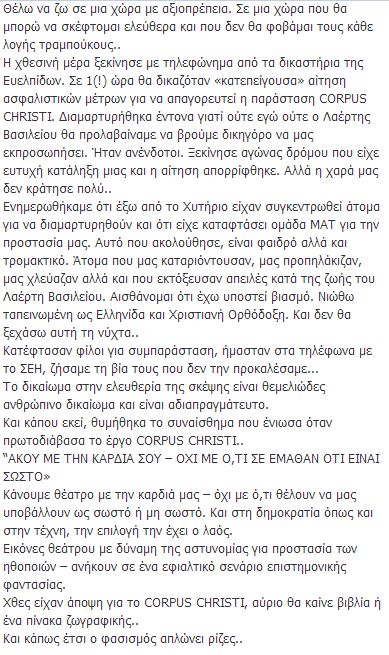 Η ηθοποιός Βάσια Παναγοπούλου, με αφορμή τα επεισόδια που έγιναν χθες έξω απο το θέατρο για την παράσταση Corpus Christi, μιλά για “τραμπούκους” μέσω Facebook τονίζει: “αισθάνομαι ότι με βίασαν” .Όλα ξεκίνησαν χθες, όταν ένα πλήθος συγκεντρώθηκε έξω από το θέατρο ” Χυτήριο” και διαμαρτυρήθηκαν για την παράσταση, που θεωρούν “αιρετική”.Για να αποφευχθούν τα χειρότερα, πήγε και μια διμοιρία των ΜΑΤ.Σήμερα, η ηθοποιός Βάσια Παναγοπούλου έγραψε: