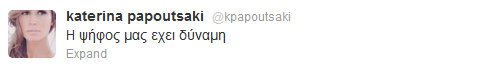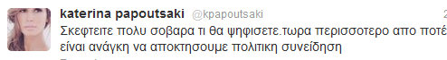 Τον τελευταίο χρόνο, η Kατερίνα Παπουτσάκη, έχει αφήσει να φανεί πως έχει έναν έντονο πολιτικό προβληματισμό – θα θυμάστε τα απανωτά tweets της τις μέρες του κινήματος των Αγανακτισμένων..Μόλις τρεις μέρες πριν τις κρίσιμες εκλογές της Κυριακής, η Κατερίνα στέλνει το δικό της μήνυμα στους αναποφάσιστους Έλληνες…