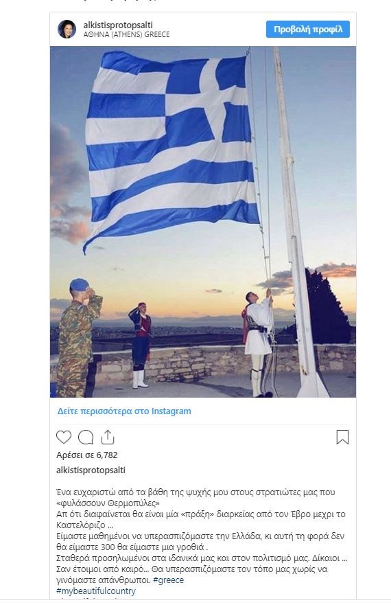 Υπενθυμίζεται ότι η Άλκηστις Πρωτοψάλτη, με ανάρτησή της στον προσωπικό της λογαριασμό στο instagram εξέφρασε δημοσίως τις ευχαριστίες της στους στρατιώτες που φυλάσσουν τα ελληνοτουρκικά σύνορα στον Έβρο. Όπως χαρακτηριστικά επισημαίνει η δημοφιλής τραγουδίστρια τα παιδιά “φυλάσσουν Θερμοπύλες”.