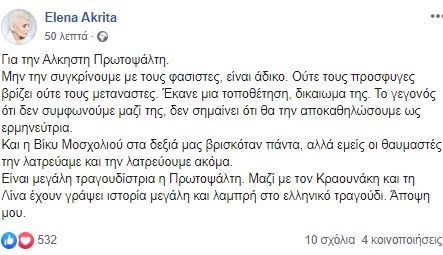 «Μην την συγκρίνουμε με τους φασίστες, είναι άδικο. Ούτε τους πρόσφυγες βρίζει ούτε τους μετανάστες. Έκανε μια τοποθέτηση, δικαίωμα της. Το γεγονός ότι δεν συμφωνούμε μαζί της, δεν σημαίνει ότι θα την αποκαθηλώσουμε ως ερμηνεύτρια. Και η Βίκυ Μοσχολιού στα δεξιά μας βρισκόταν πάντα, αλλά εμείς οι θαυμαστές την λατρεύαμε και την λατρεύουμε ακόμα. Είναι μεγάλη τραγουδίστρια η Πρωτοψάλτη. Μαζί με τον Κραουνάκη και τη Λίνα έχουν γράψει ιστορία μεγάλη και λαμπρή στο ελληνικό τραγούδι. Άποψη», σημειώνει χαρακτηριστικά η Έλενα Ακρίτα.