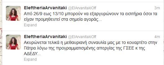 Ακυρώνεται η συναυλία της Ελευθερίας Αρβανιτάκη την Τετάρτη στην Πάτρα λόγω της απεργίας της ΓΣΕΕ και της ΑΔΕΔΥ. Το έγραψε η ίδια στο Twitter. “Ακυρώνεται τελικά η μεθαυριανή συναυλία μας με το κουαρτέτο στην Πάτρα λόγω της προγραμματισμένης απεργίας της ΓΣΕΕ κ της ΑΔΕΔΥ”, έγραψε η γνωστή τραγουδίστρια και σε νέο tweet ανέφερε: “Από 26/9 έως 13/10 μπορούν να εξαργυρώνουν τα εισιτήρια όσοι τα είχαν προμηθευτεί στα σημεία αγοράς”.