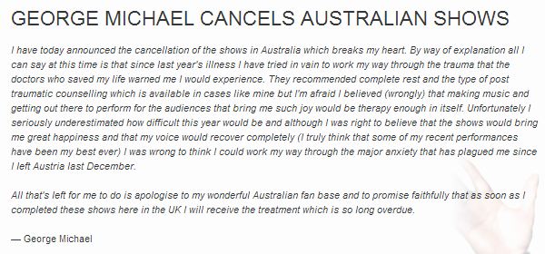 O George Michael ανακοίνωσε την ακύρωση των συναυλιών του στην Αυστραλία, μέσα από την επίσημη ιστοσελίδα του.Ο λόγος της ακύρωσης, που όπως γράφει “ραγίζει την καρδιά μου” δεν είναι άλλος από την κλονισμένη του υγεία, ύστερα από την περιπέτεια που είχε, τον προηγούμενο Δεκέμβριο.Είχε προγραμματίσει τις συναυλίες, γιατί πίστευε ότι η φωνή του δεν θα είχε πρόβλημα, αλλά φαίνεται ότι έκανε λάθος.Δεν παραλειψε να ζητήσει συγγνώμη και δίνει την υπόσχεση στους fans του στην Αυστραλία, ότι μόλις τελειώσει τις συναυλίες του στην Αγγλία, θα ακολουθήσει φαρμακευτική αγωγή που θα τον βοηθήσει να πραγματοποιήσει τις συναυλίες του εκεί.Αυτή είναι η ανακοίνωσή του: