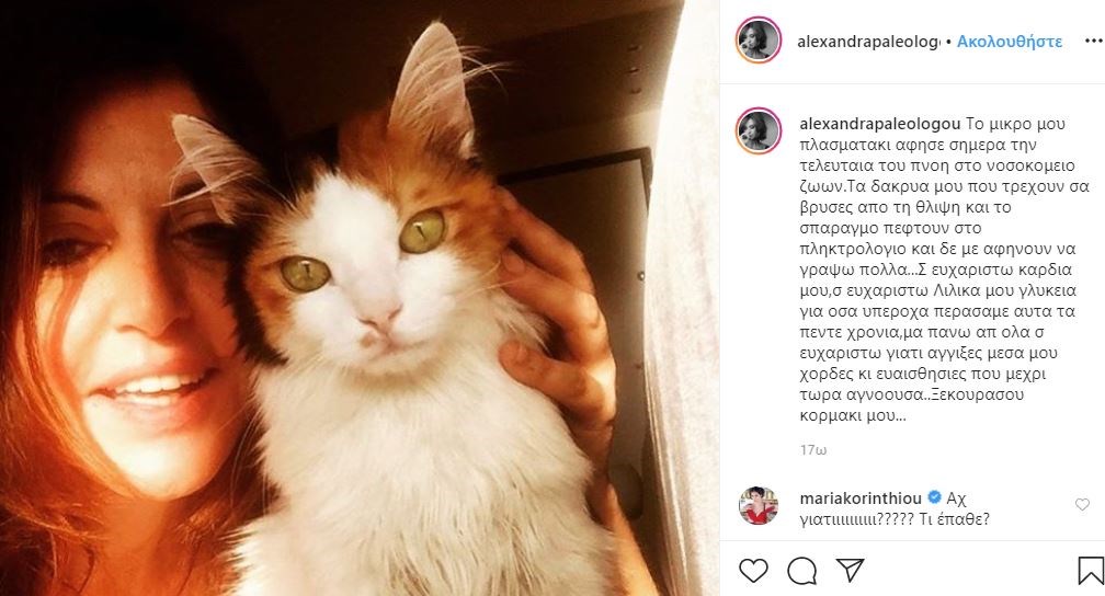 Η γνωστή ηθοποιός Αλεξάνδρα Παλαιολόγου ανέβασε μία φωτογραφία στον προσωπικό της λογαριασμό στο Instagram στην ποζάρει μαζί με τη γάτα της, τη Λιλίκα.