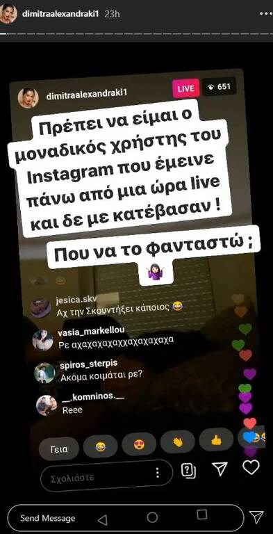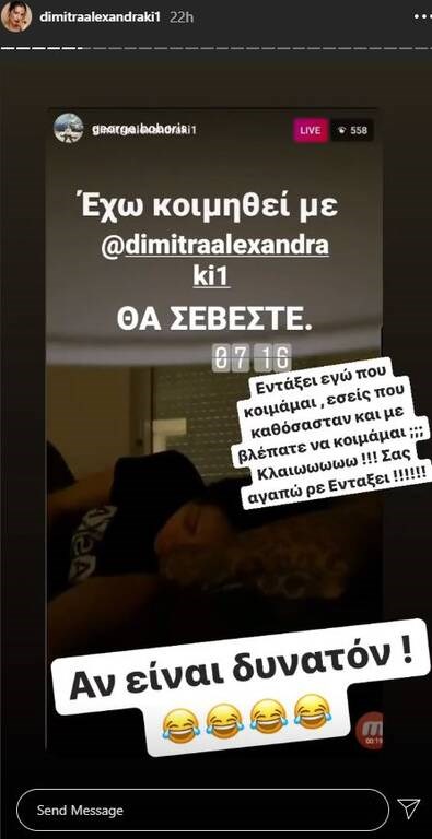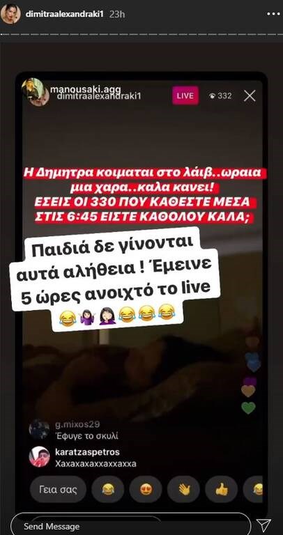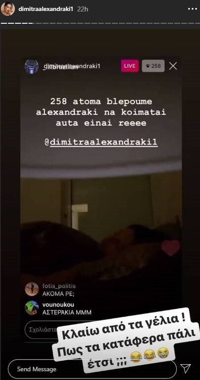 «Παιδιά δεν γίνονται αυτά αλήθεια. Έμεινε πέντε ώρες ανοιχτό το live. Πρέπει να είμαι ο μοναδικός χρήστης του Instagram που έμεινε πάνω από μια ώρα και δε με κατέβασαν. Που να το φανταστώ;… Εντάξει εγώ που κοιμάμαι, εσείς που καθόσασταν και με βλέπατε να κοιμάμαι; Κλαίω. Σας αγαπώ ρε εντάξει» έγραψε η ίδια.