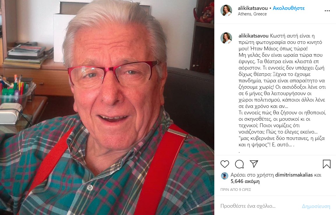 «Κωστή αυτή είναι η πρώτη φωτογραφία σου στο κινητό μου! Ήταν Μάιος όπως τώρα! Μη γελάς δεν είναι ωραία τώρα που έφυγες. Τα θέατρα είναι κλειστά επ’ αόριστον. Τι εννοείς δεν υπάρχει ζωή δίχως θέατρο; Ξέχνα το έχουμε πανδημία, τώρα είναι απαραίτητο να ζήσουμε χωρίς! Οι αισιόδοξοι λένε ότι σε 6 μήνες θα λειτουργήσουν οι χώροι πολιτισμού, κάποιοι άλλοι λένε σε ένα χρόνο και αν… Τι εννοείς πώς θα ζήσουν οι ηθοποιοί, οι σκηνοθέτες, οι μουσικοί κι οι τεχνικοί; Ποιοι νομίζεις ότι νοιάζονται; Πώς το έλεγες εκείνο… “μας κυβερνάνε δύο που@@@@ς, η μίζα και η ψήφος”! Ε, αυτό… .