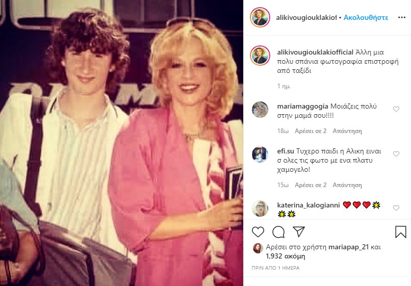 Ακόμη μίασπάνια φωτογραφία της μητέρας του, ανήρτησε o Γιάννης Παπαμιχαήλ στον λογαριασμό που έχει δημιουργήσει στο instagram στη μνήμη της αξέχαστης Αλίκης Βουγιουκλάκη. “Άλλη μια πολύ σπάνια φωτογραφία επιστροφή από ταξίδι” γράφει στη λεζάντα της φωτογραφίας, όπου στέκεται και ο ίδιος στο πλευρό της μητέρας του.