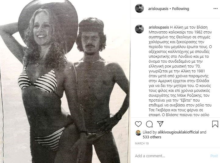 Ένα σπάνιο ντοκουμέντο από την περίοδο του μεγάλου έρωτα της Αλίκης Βουγιουκλάκη με τον Βλάσση Μπονάτσο, δημοσίευσε στον προσωπικό του λογαριασμό στο instagram o δημοσιογράφος Άρης Λούπασης. Πρόκειται για μία φωτογραφία που έχει τραβηχτεί το καλοκαίρι του 1982 στον Θεολόγο , στην οποία οι αείμνηστοι καλλιτέχνες ποζάρουν στον φακό φορώντας μαγιό.