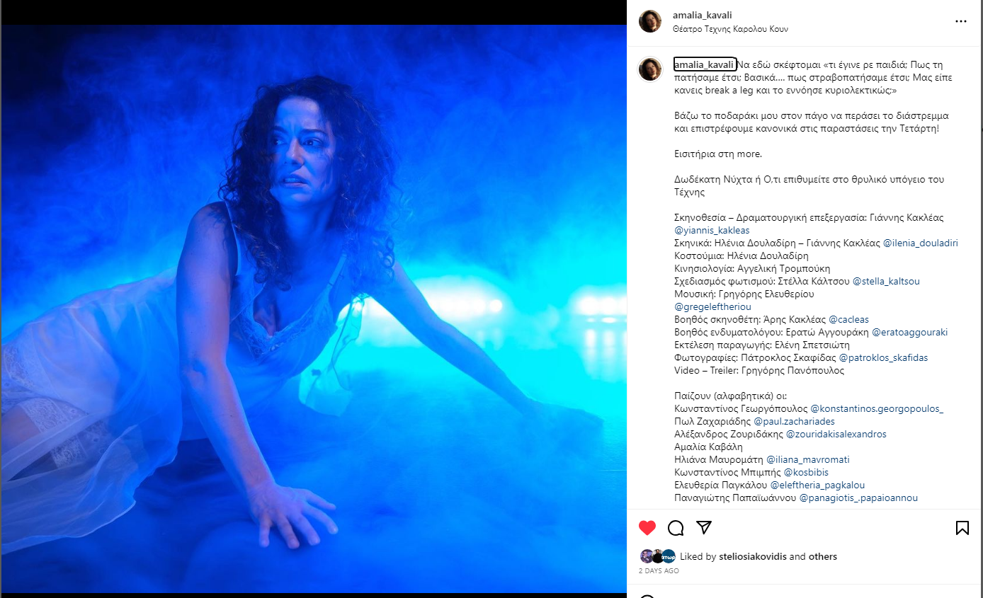 Η “Δωδέκατη νύχτα ή ότι επιθυμείτε”, η παράσταση η οποία πρωταγωνιστεί η ηθοποιός ξεκίνησε φέτος με… “αντικειμενικές δυσκολίες”. Την πρώτη εβδομάδα ο covid κάνει την εμφάνισή του και “έπεσε η αυλαία”.