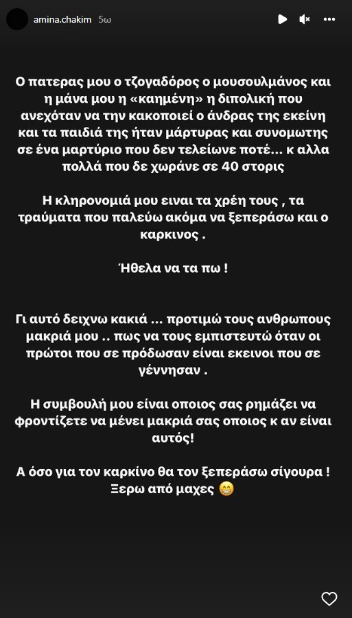 Και συνέχισε: “Ο πατέρας μου ο τζογαδόρος ο μουσουλμάνος και η μάνα μου η “καημένη”, η διπολική που ανεχόταν να την κακοποιεί ο άντρας της εκείνη και τα παιδιά της. Ήταν μάρτυρας και συνωμότης σε ένα μαρτύριο που δεν τελείωνε ποτέ… κι άλλα πολλά που δε χωράνε σε 40 στορις. Η κληρονομιά μου είναι τα χρέη τους, τα τραύματα που παλεύω ακόμα να ξεπεράσω και ο καρκίνος. Ήθελα να τα πω.