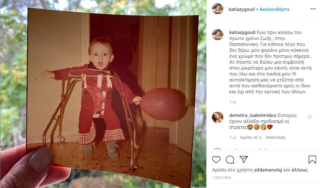 Η Κάτια Ζυγούλη συνόδευσε τη φωτογραφία με το σχόλιο: “Εγώ πριν κλείσω τον πρώτο χρόνο ζωής , στην Θεσσαλονίκη. Για κάποιο λόγο που δεν ξέρω, μου φοράνε μόνο κόκκινα, ένα χρώμα που δεν προτιμώ σήμερα. Αν έπρεπε να δώσω μια συμβουλή στον μικρότερο μου εαυτό, είναι αυτή που λέω και στα παιδιά μου: Η αυτοεκτίμηση μας να χτίζεται από αυτά που αισθανόμαστε εμείς οι ίδιοι και όχι από την κριτική των άλλων.”