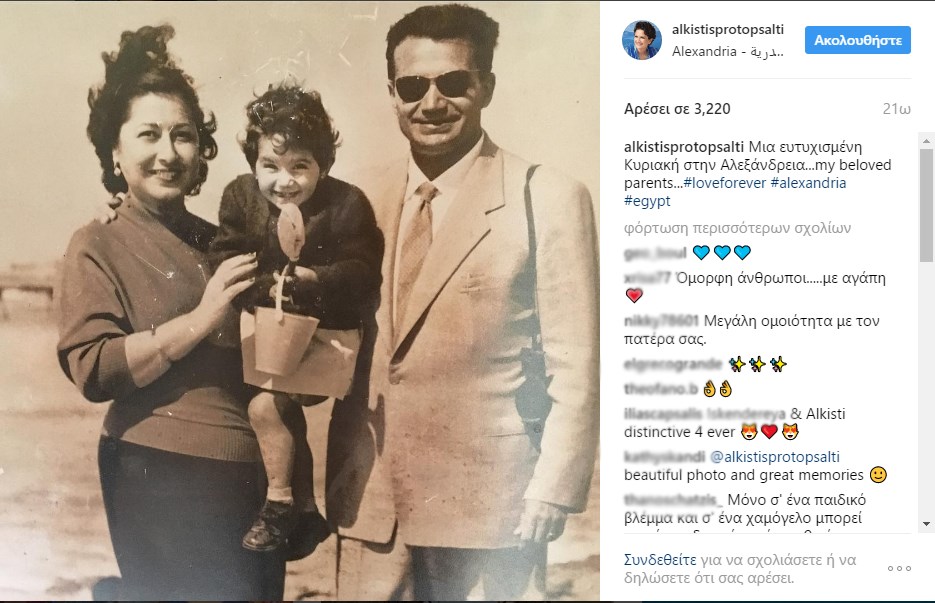 Το μικρό κορίτσι της φωτογραφίας, είναι η Άλκηστις Πρωτοψάλτη, η οποία γεννήθηκε στην Αλεξάνδρεια της Αιγύπτου, και έγραψε χαρακτηριστικά: “Μια ευτυχισμένη Κυριακή στην Αλεξάνδρεια…my beloved parents…”.