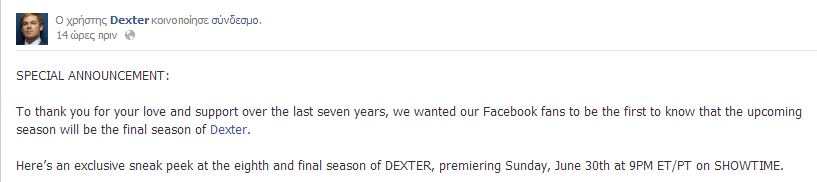 ” Για να σας ευχαριστήσουμε για την αγάπη και την υποστήριξή σας, θέλαμε οι fans στο Facebook να είναι οι πρώτοι που θα μάθουν ότι η ερχόμενη σεζόν του Dexter θα είναι η τελευταία”.