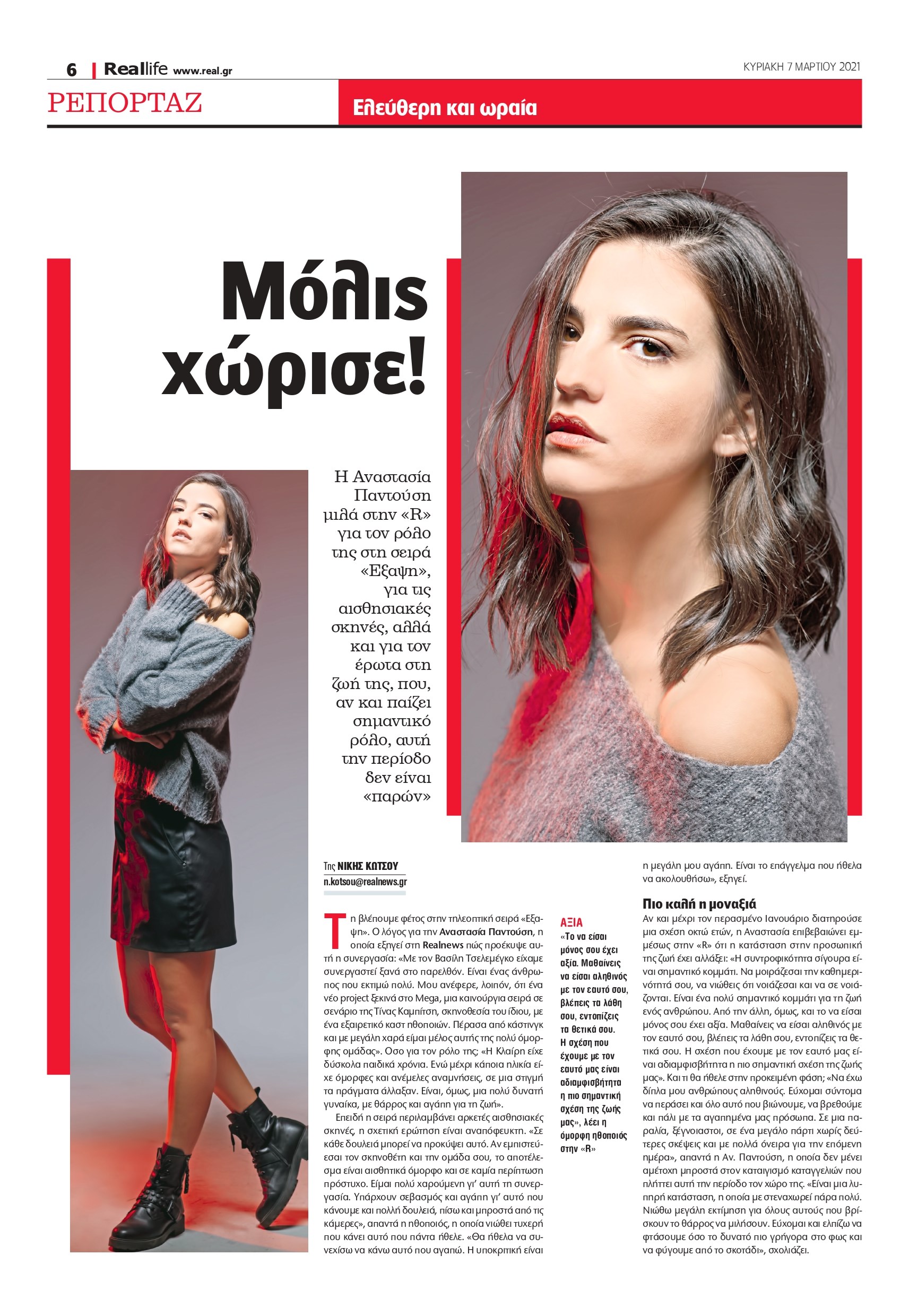 Τη βλέπουμε φέτος στην τηλεοπτική σειρά «Έξαψη». Ο λόγος για την Αναστασία Παντούση, η οποία εξηγεί στη Realnews πώς προέκυψε αυτή η συνεργασία: «Με τον Βασίλη Τσελεμέγκο είχαμε συνεργαστεί ξανά στο παρελθόν. Είναι ένας άνθρωπος που εκτιμώ πολύ. Μου ανέφερε, λοιπόν, ότι ένα νέο project ξεκινά στο Mega, μια καινούργια σειρά σε σενάριο της Τίνας Καμπίτση, σκηνοθεσία του ίδιου, με ένα εξαιρετικό καστ ηθοποιών. Πέρασα από κάστινγκ και με μεγάλη χαρά είμαι μέλος αυτής της πολύ όμορφης ομάδας». Όσο για τον ρόλο της; «Η Κλαίρη είχε δύσκολα παιδικά χρόνια. Ενώ μέχρι κάποια ηλικία είχε όμορφες και ανέμελες αναμνήσεις, σε μια στιγμή τα πράγματα άλλαξαν. Είναι, όμως, μια πολύ δυνατή γυναίκα, με θάρρος και αγάπη για τη ζωή».