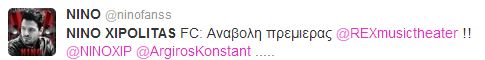 Η προγραμματισμένη για σήμερα πρεμιέρα του Νίνο, του Κωνσταντίνου Αργυρού και της Άντζελας Δημητρίου, στο Rex Music Theater, αναβάλλεται…
