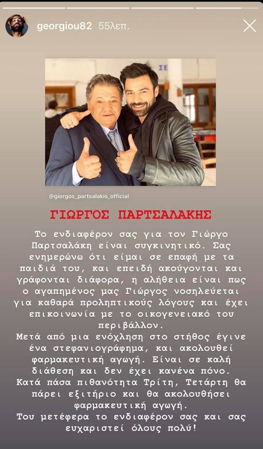 “Το ενδιαφέρον σας για τον Γιώργο Παρτσαλάκη είναι συγκινητικό. Σας ενημερώνω ότι είμαι σε επαφή με τα παιδιά του, και επειδή ακούγονται και γράφονται διάφορα, η αλήθεια είναι πως ο Γιώργος μας νοσηλεύεται για καθαρά προληπτικούς λόγους και έχει επικοινωνία με το οικογενειακό του περιβάλλον. Μετά από μια ενόχληση στο στήθος έγινε στεφανιογράφημα, και ακολουθεί φαρμακευτική αγωγή. Είναι σε καλή διάθεση και δεν έχει κανένα πόνο. Κατά πάσα πιθανότητα Τρίτη, Τετάρτη θα πάρει εξιτήριο και θα ακολουθήσει φαρμακευτική αγωγή. Του μετέφερα το ενδιαφέρον σας και σας ευχαριστεί όλους πολύ”, έγραψε συγκεκριμένα σε ανάρτησή του στο instagram ο Ανδρέας Γεωργίου. Οι δυο τους συνεργάζονται στη σειρά του ΣΚΑΙ, “8 Λέξεις”.