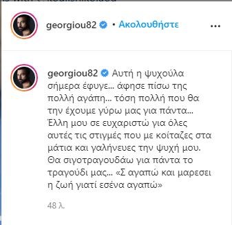 “Αυτή η ψυχούλα σήμερα έφυγε… άφησε πίσω της πολλή αγάπη… τόση πολλή που θα την έχουμε γύρω μας για πάντα… Έλλη μου σε ευχαριστώ για όλες αυτές τις στιγμές που με κοίταζες στα μάτια και γαλήνευες την ψυχή μου. Θα σιγοτραγουδάω για πάντα το τραγούδι μας… «Σ αγαπώ και μ’ αρέσει η ζωή γιατί εσένα αγαπώ».