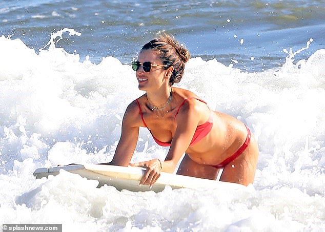 Παιχνίδια στη θάλασσα για τη Βραζιλιάνα καλλονή Αλεσάντρα Αμπρόσιο, η οποία έπεσε στα κύματα του Μαλιμπού κρατώντας μια ιστιοσανίδα του σερφ.