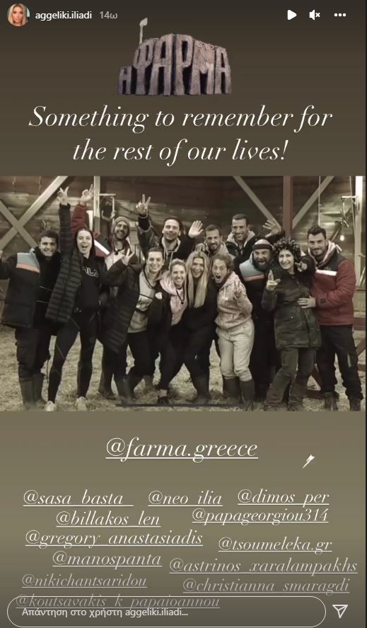 Οι μοναδικές στιγμές που έζησε μέσα στη “Φάρμα” θα τις μείνουν αξέχαστες, όπως έγραψε η ίδια στον λογαριασμό της στο Instagram. Βγαίνοντας από το ριάλιτι, η Αγγελική Ηλιάδη συνεχίζει να είναι ζευγάρι με τον Γρηγόρη Αναστασιάδη αλλά και να κάνει στενή παρέα με την Σάσα Μπάστα.