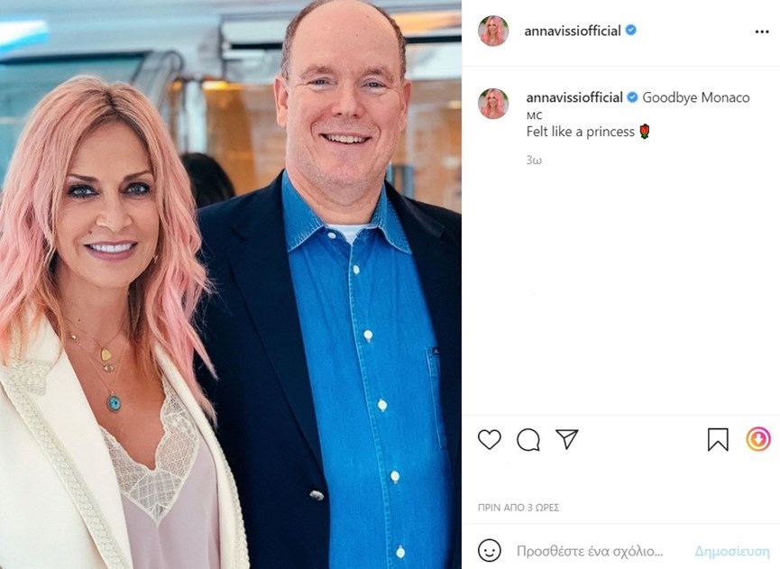 Συναντήθηκε μάλιστα με τον Πρίγκιπα Αλβέρτο του Μονακό, με τον οποίο φωτογραφήθηκε και δημοσίευσε μια κοινή φωτογραφία. «Νιώθω σαν πριγκίπισσα», έγραψε χαρακτηριστικά η Άννα Βίσση. Φυσικά τα ροζ μαλλιά της τραγουδίστριας, που είναι το νέο look που έχει υιοθετήσει το τελευταίο διάστημα, συζητήθηκε αρκετά από τους ακολούθους της.