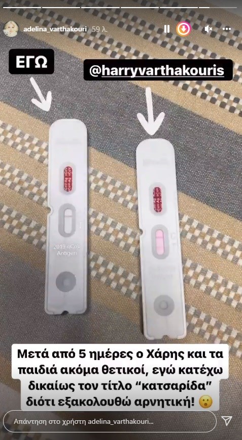 Σήμερα, πέντε ημέρες μετά την αρχική διάγνωση, η οικογένεια υποβλήθηκε σε self test και η Αντελίνα Βαρθακούρη θέλησε να μοιραστεί με τους ακολούθους της στο Instagram τα αποτελέσματα.