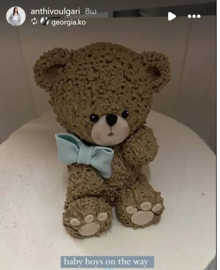 «Η πιο ωραία τούρτα και ας πέρασε περιπέτεια», έγραψε στην τούρτα που έκανε repost και είχε πάνω της ένα αρκουδάκι με γαλάζιο φιόγκο. Μάλιστα σχολίασε: «Baby boy on the way».