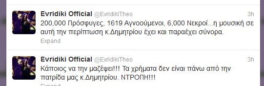 Την οργισμένη αντίδραση των Κύπριων καλλιτεχνών, έχει προκαλέσει η είδηση πως η Άντζελα Δημητρίου έχει δεχτεί πρόταση για να τραγουδήσει στα κατεχόμενα – κάτι που η ίδια, μέχρι στιγμής δεν έχει διαψεύσει…Μεταξύ αυτών που τοποθετήθηκαν στο twitter ήταν η Ευρυδίκη, απαντώντας στο σχόλιο της ‘Αντζελας “η μουσική δεν έχει σύνορα”…