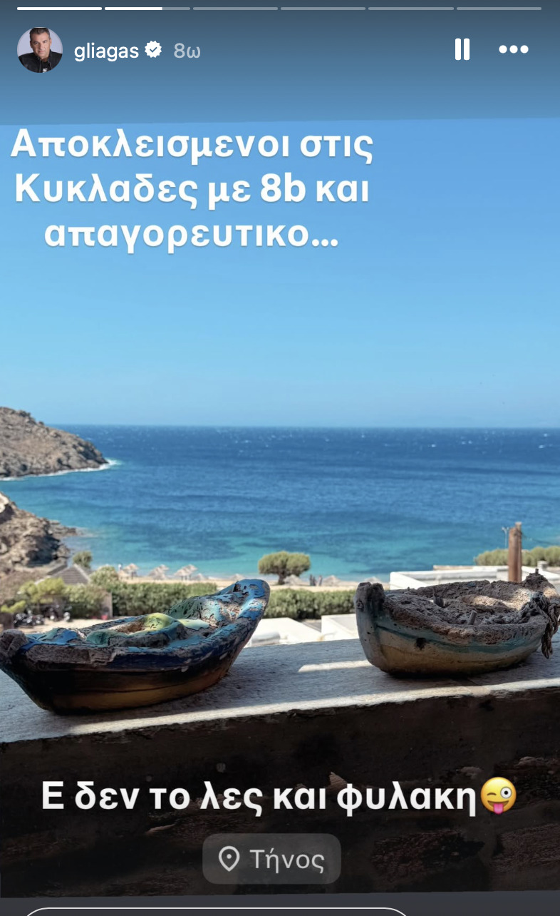 Με τη γνωστή του αίσθηση του χιούμορ, ο Γιώργος Λιάγκας επέλεξε να σχολιάσει την κατάσταση μέσω Instagram, δημοσιεύοντας φωτογραφία από την Τήνο και γράφοντας: «Αποκλεισμένοι στις Κυκλάδες με 8 μποφόρ και απαγορευτικό. Ε, δεν το λες και φυλακή».